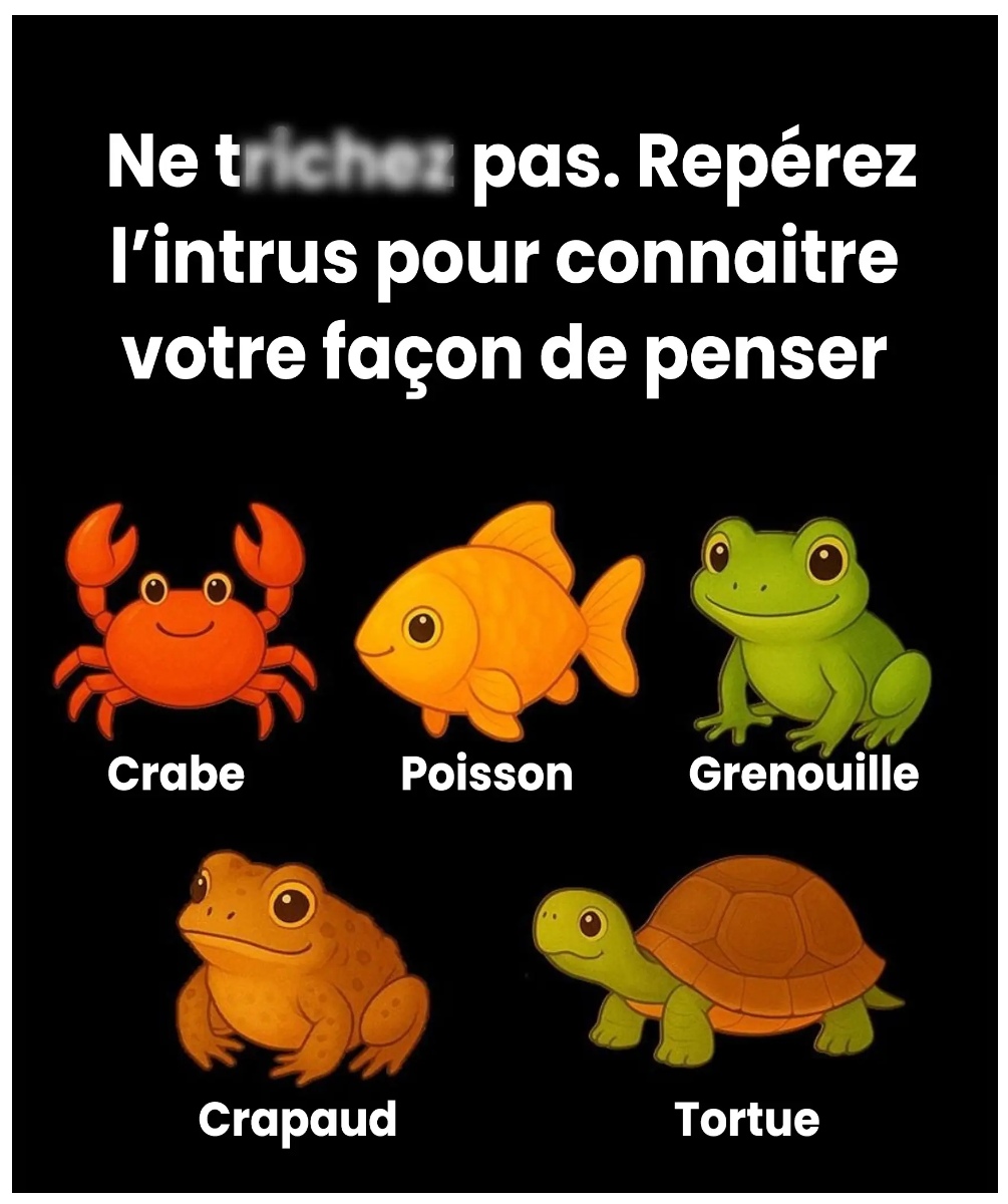 animaux, un seul intrus… et une révélation surprise à la clé. Derrière leur apparence ludique, ils éveillent notre curiosité : pourquoi choisit-on spontanément tel animal plutôt qu’un autre ? Qu’est-ce qui se cache derrière ce réflexe si immédiat ? Et si votre premier élan en disait un peu plus que vous ne le pensez sur votre manière d’observer le monde ? Avant de découvrir les interprétations, prenez un moment pour imaginer ces cinq compagnons : un crabe, un poisson, une grenouille, un crapaud et une tortue. Lequel vous semble “différent” sans réfléchir ? Gardez votre choix en tête… c’est parti !